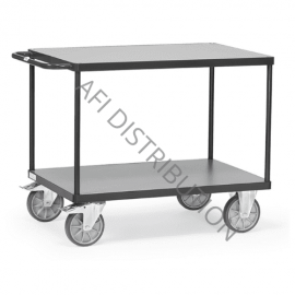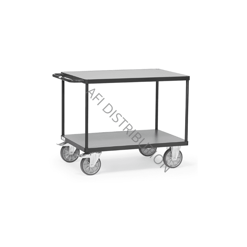 Servante de magasin mécano-soudé grise à deux plateaux en bois avec une charge de 600 Kgs. Sa poignée disposée dans le prolongement du plateau supérieur permet le transport de charges longues. Deux roues pivotantes freinées et 2 roues fixes TPE offrent une parfaite magnabilité avec peu de résistance au roulement. 4 roues pivotantes sont disponibles en option comme de nombreux accessoires.